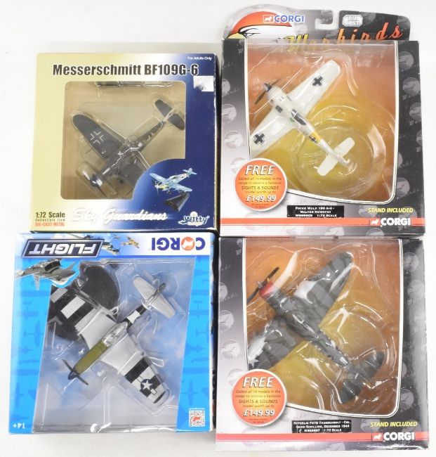 Corgi Warbirds 1:172 scale WB99607 Thunderbolt, WB99613 Messerschmitt, WB99605 Focke Wulf, WB99610 Curtiss Kittyhawk, together with Corgi 49001 Spitfire, 49101 Hurricane, CC99304 Mustang P51, Sky Guardians Messerschmitt BF109G-6 in original boxes (9) (box)