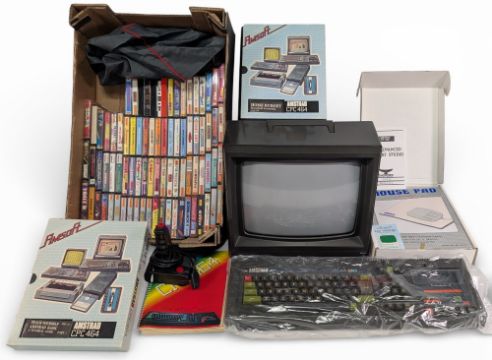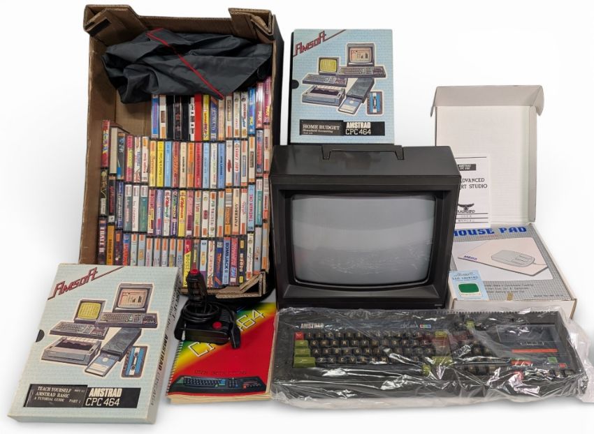 Vintage Amstrad CPC 464 64K Colour Personal Computer, Amstrad CTM 640 Colour Monitor, plus a quantity of games (cassette format) including Amosoft software and mouse pad. The console is missing its power lead, all sold in untested condition. Collection recommended