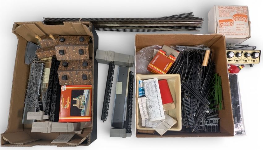 Hornby OO Gauge Quick Fit Buildings Bridges, gauge master controller model DS, Peco straight track, points engine sheds, station buildings, platform and a large bridge
