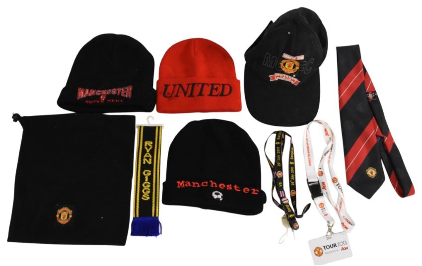 Manchester United FC bundle to include a scarf v Bayern Munich 2002 Champions League S/F, a striped Manchester United scarf, an official treble scarf, a ‘We’ll Never Die’ scarf, an FCUM scarf, three hats, a cap, a snood, official tie, two lanyards, a small Ryan Giggs Scarf and a large Flag. All in VG-G condition