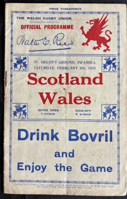 1933 Wales v Scotland Rugby Programme: At Swansea, G, grubby rear cover