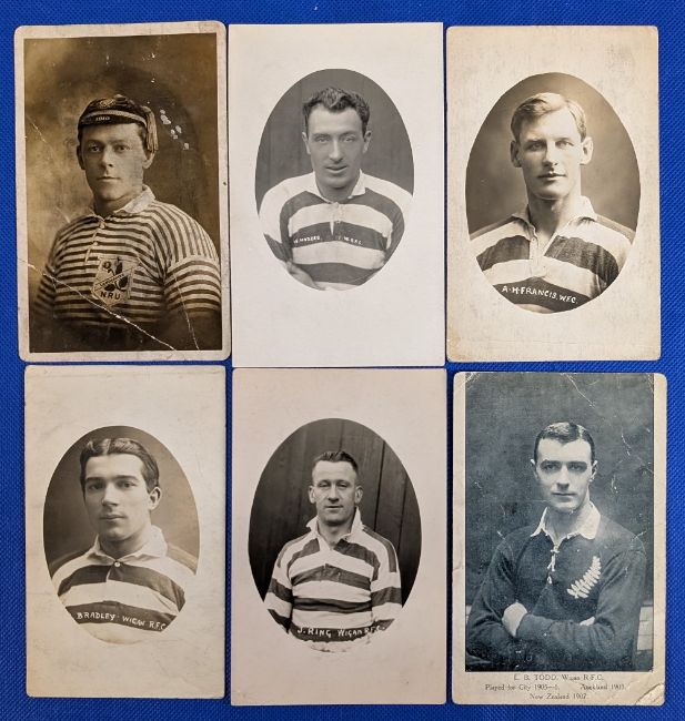 6x Early Wigan Rugby League Player Portrait Postcards, with players of A Francis, Bolenski, Bradley, J Ring, L B Todd, W Hodder, c1910-1920 one postally used, 2 with signs of glue to backs (6)