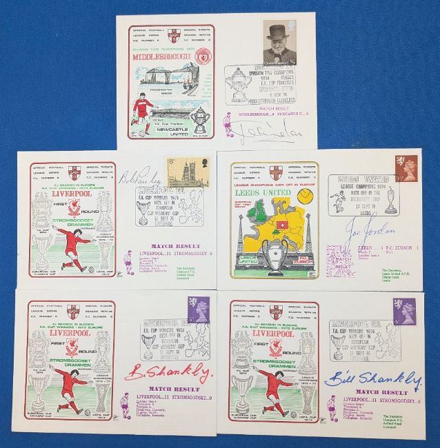 5x 1974 Signed Football FDC covers, Leeds v FC Zurich Joe Jordan, Liverpool v Stremsgodset Bob Paisley, B Shankly and a full signature of Bill Shankly, Middlesbrough v Newcastle Jack Charlton (Dawn 5)