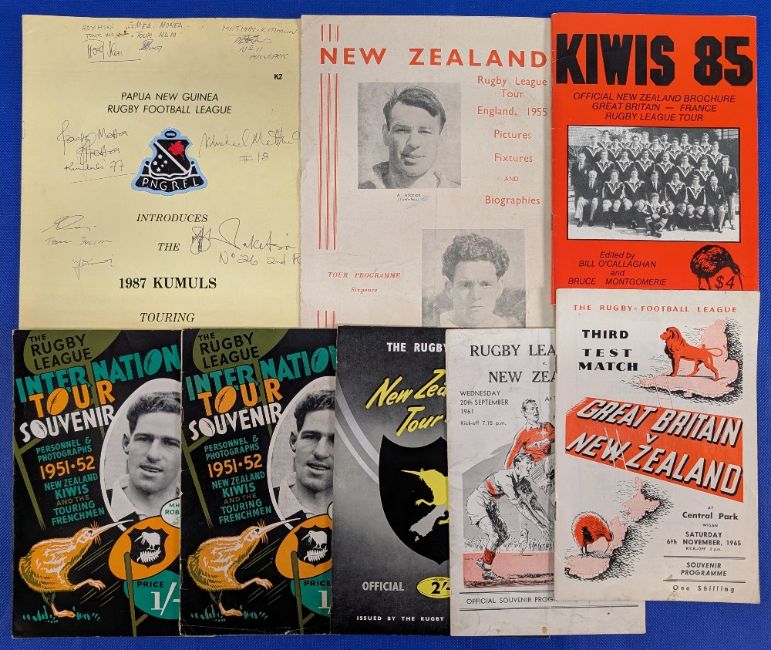New Zealand & Papua New Guinea Rugby Programmes Booklets: two international tour souvenirs 1951-52, 1955 tour programme, 1955 tour souvenir, Rugby League XII 20th Sept 1961, GB 6th Nov 1965, Kiwi’s 85 tour guide, Papua New Guinea multi signs 1987 Kumlus touring Great Britain and France