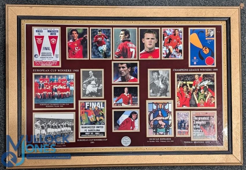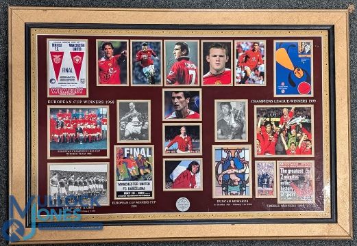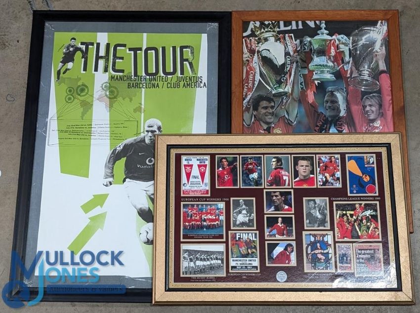 3x Manchester United Modern Football Prints, winners Montague, the Treble Glory 99, the Club's America tour reprinted poster - all framed and mounted under glass - the largest is size 69cm x 100cm (3). Collection recommended