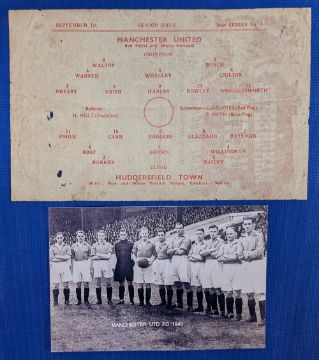 1945/46 Manchester United v Huddersfield Town single sheet match programme no. 1 (new series) 1st September 1945, small mark, light creasing, no writing; plus postcard b&w photo of the United team prior to the match. (1 programme, 1 postcard)