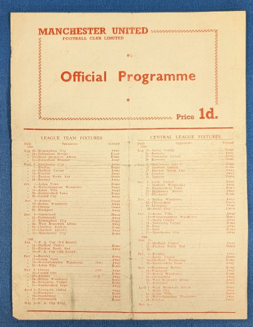 1955/56 Manchester United Public Practice matches Reds v Blues senior match, Reds v Blues junior match, single sheet, no writing, overall good. (1)