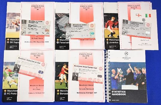 1996/97 Manchester Utd Champions League programmes homes to include Rapid Vienna and Executive Suite Menu and match ticket; Fenerbahce Executive Menu and match ticket; Juventus Executive Suite Menu, special lunch Menu card and match ticket; FC Porto and Executive Suite Menu and match ticket; FC Porto and Executive Suite Menu and match ticket; Borussia Dortmund (s/f) and Executive Suite Menu and match ticket; also 1996/97 Champions League Statistics handbook (200and pages); fair/good (5 programmes, 6 Menus, 5 match tickets, 1 handbook)