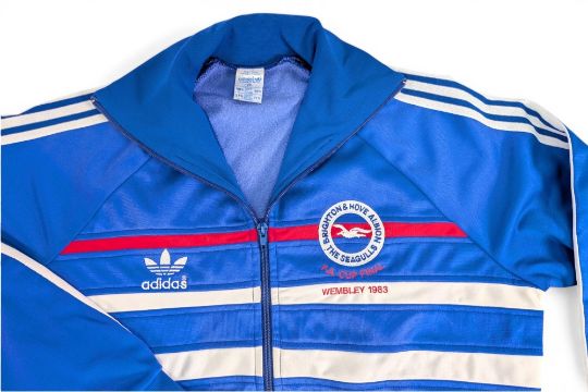 1983 FA Cup Final Addidas Brighton & Hove Albion v Manchester United Football Squad issued Tracksuit Top, embroidered with Brighton & Hove Albion the Seagulls FA Cup Final Wembley 1983, size 186 - 6ft 1” - match issued top - for Bob “The Cat” Bevan’s personal sporting memorabilia collection, presented to Bob "The Cat" when hired to relax and amuse the Brighton team ahead of the final. A rare opportunity to own FA Final history, in good condition