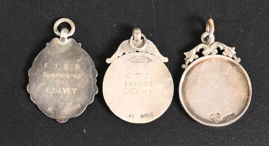 3x 1920-1951 Silver Football Fob Medals: two engraved C T C 1929-30 C Kemp, and a F I S A runners up E Davey 1951, and a blank silver fob - #22g (3)