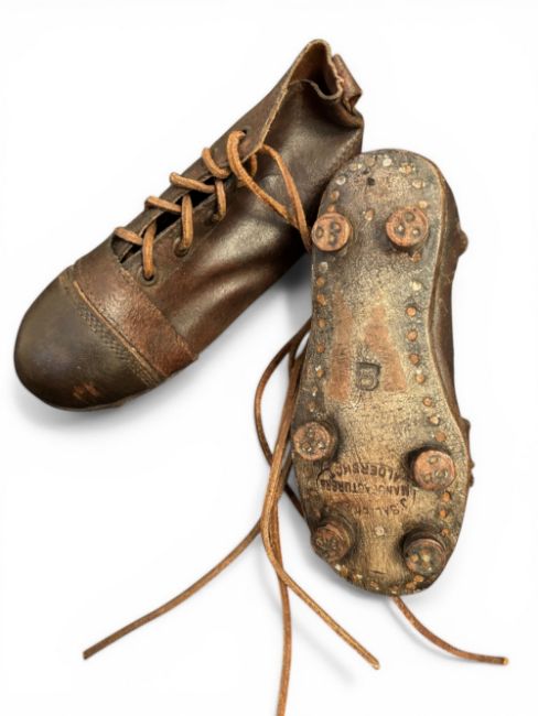 Vintage Brown high-ankle 1930s Rugby Boots, Size 9 and Child’s Size 8 (2): The adult pair, size 9, have hardened toe cap, strap, six naily studs, ankle bone protectors and full laces; the children’s, also used, made by Salter’s of Aldershot, are very similar and feel even tougher to ‘break in’. A different rugby world!