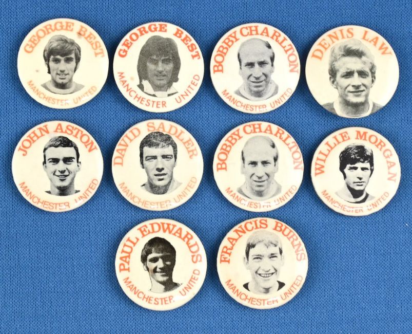 Manchester United early 1970s tin badges approx 30mm diameter Denis Law, Bobby Charlton, John Aston, David Sadler, Bobby Charlton, Willie Morgan, Francis Burns, Paul Edwards, George Best x2 different; (10 badges in 5 packs of 2)