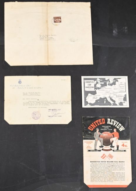 1957 Poster: Real Madrid v Manchester United size 17 ½" x 25 ¾" framed and glazed, European Cup Semi-Final at Partido Pro Zona Deportiva Stadium Santiago Bernabeu, Madrid 11 April 1957 at 4.30pm (folds but kept flat, has some clear tape to the fold). Additional framed and glazed black back board with letter from Real Madrid Futbol Club dated 17 April 1957, signed Antonio Calderon Hernandez, together with franked and stamped envelope to the vendor; also has the second leg match programme Manchester United v Real Madrid 25 April 1957. NB: The vendor wrote to the Real Madrid club in 1957 requesting a match programme (no official programme issued) and Real Madrid returned the European Cup semi-final club poster as a gift. Also in 2008 Bonham Auctions sold a similar poster for £1620. The vendor has provided a copy of that sale result by means of an online confirmation copy. (2 frames)