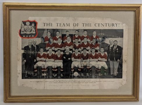 1955-56 Manchester United Busby Babes multi team photograph centre page, signed by Ducan Edwards, Wilf McGuiness, Mark Jones, Jimmie Whelan, Tommy Taylor, with a faint Voilet signature, and an exceptional scarce part signed team image booklet colour pages 20 and 21 by the Manchester United `Busby Babes`, c1955-56, the image depicting the team standing and seated with notes added (considerable wear to corners, has been folded). Mounted and framed on card under glass -size 33cm x 44cm