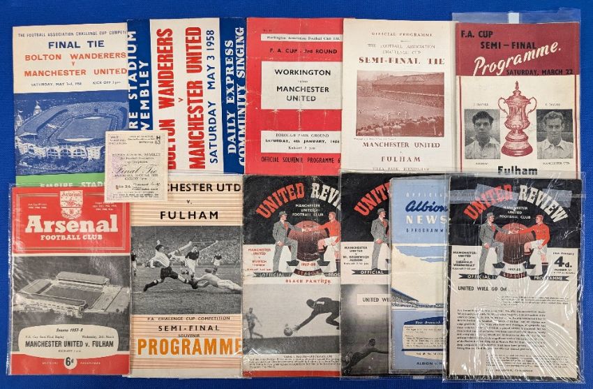 1957/58 Manchester United FAC runners-up, collection of programmes in the FA Cup as follows: 3rd round Workington (away) (fold), 4th round Ipswich Town (home) (fold and token intact), 5th round Sheffield Wednesday (home) (team blank, token removed), 6th round WBA (away), WBA (home) (has token), s/f v Fulham, Fulham (souvenir by South Western Publicity, Fulham (fold out souvenir by Dawson), Fulham (s/f replay) FAC Final programme (reprint), song sheet, match ticket; (8 programmes, 2 souvenirs, 1 song sheet, 1 ticket)