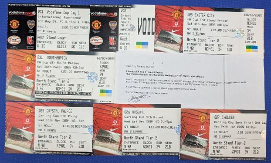 TICKETS: 2004/05 Manchester United home match tickets Vodafone Cup v PSV Eindhoven (3 August), Urawa Red Diamonds (5 August – match cancelled due to electrical storm); FAC home v Exeter City (complete ticket), Southampton replay home (pre-issue, match not played); Carling Cup homes v Crystal Palace, Arsenal, Chelsea (Carling s/f); good. (7)
