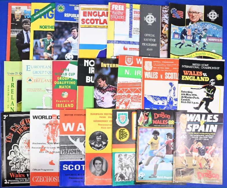 Selection of international football programmes, 1995 Umbro Cup (full set) England v Japan, Brazil v Sweden, Japan v Brazil, England v Sweden, Sweden v Japan, England v Brazil (final); England international homes 1963-1989 (22); England schools/’B’ internationals (7); Scotland international homes 1970 v Denmark, 1972 Wales (U23s), 1988 Yugoslavia, 1992 Northern Ireland, 1992 Portugal, 1992 Italy, 1993 Malta, 1993 Germany,1993 Estonia, 1993 Switzerland; Northern Ireland v 1973 Bulgaria, 1991 Faroe Islands, 1993 Republic of Ireland, 1990 England U21s), 1990 England, 1993 Northern Ireland, 1995 England; Wales international homes 1969 Scotland, 1972 Northern Ireland, 1976 England, 1976 England (Wales centenary), 1977 Czechoslovakia), 1977 Scotland, 1978 Malta, 1979 West Germany, 1983 Brazil, 1985 Spain, 1986 Uruguay, 1987 Czechoslovakia, 1989 Sweden, 1989 Holland, 1990 Belgium, 1991 Germany, 1992 Faroe Islands, 1993 Belgium, 1994 Scotland (B game), 1994 Norway, 1998 Italy; Selection of ITV Sport/News of the World match programmes official club issues 1990/91 Spurs v Liverpool (Issue no. 2), 1990/91 Manchester City v Leeds United (Issue no. 3), 1990/91 Everton v Spurs (Issue no. 4), 1990/91 Manchester United v Chelsea (Issue no. 5), 1990/91 Arsenal v Liverpool (Issue no. 6), 1990/91 Leeds United v Everton (Issue no. 7), 1990/91 Aston Villa v Arsenal (Issue no. 8), 1990/91 Crystal Palace v Liverpool (Issue no. 9), 1990/91 Everton v Manchester City (Issue no. 10), 1990/91 Derby County v Spurs (Issue no. 11), 1990/91 Manchester United v Liverpool (Issue no. 12), 1990/91 Manchester United v Leeds United Rumbelows Cup s/f (Issue no. 13), 1990/91 Leeds United v Manchester United Rumbelows Cup s/f (Issue no. 14), 1990/91 Southampton v Liverpool (Issue no. 17), 1990/91 Nottingham Forest v Liverpool (Issue no. 18), 1990/91 Manchester United v Sheffield Wednesday Rumbelows Cup Final), 1991/92 Manchester City v Southampton (no. 12); Football League Cup s/f’s 1967/68 Leeds United v Derby County, 1971/72 Stoke City v WHU (2nd replay at Manchester United), 1972/73 Spurs v Wolves, 1988/89 Littlewoods Nottingham Forest v Bristol City, Bristol City v Nottingham Forest, Luton Town v WHU, WHU v Luton Town, 1989/90 Littlewoods WHU v Oldham Athletic, Oldham Athletic v WHU, Nottingham Forest v Coventry City and Coventry City v Nottingham Forest; 1990/91 Rumbelows Sheffield Wednesday v Chelsea, Chelsea v Sheffield Wednesday, 1991/92 Rumbelows Spurs v Nottingham Forest, Nottingham Forest v Spurs, Middlesbrough v Manchester United, Manchester United v Middlesbrough, 1992/93 Coca Cola Crystal Palace v arsenal, Arsenal v Crystal Palace, Blackburn Rovers v Sheffield Wednesday, Sheffield Wednesday v Blackburn Rovers, 1993/94 Coca Cola Tranmere Rovers v Aston Villa, Aston Villa v Tranmere Rovers, Manchester United v Sheffield Wednesday (Sir Matt Busby 1909-1994 remembered), Sheffield Wednesday v Manchester United, 1994/95 Coca Cola Liverpool v Crystal Palace, Crystal Palace v Liverpool, Swindon Town v Bolton Wanderers, Bolton Wanderers v Swindon Town, 1995/96 Coca Cola Arsenal v Aston Villa, Aston Villa v Arsenal, Birmingham City v Leeds United, Leeds United v Birmingham City. 1996/97 Coca Cola Middlesbrough v Stockport County, Stockport County v Middlesbrough, Wimbledon v Leicester City, Leicester City v Wimbledon, 1997/98 Coca Cola Chelsea v Arsenal, Arsenal v Chelsea, Middlesbrough v Liverpool, Liverpool v Middlesbrough, 1998/99 Worthington Cup Sunderland v Leicester City, Leicester City v Sunderland, Spurs v Wimbledon, Wimbledon v Spurs, 1999/2000 Worthington Bolton Wanderers v Tranmere Rovers, Tranmere Rovers v Bolton Wanderers, Leicester City v Aston Villa, Aston Villa v Leicester City; generally good, some small faults. (1 box of quantity)