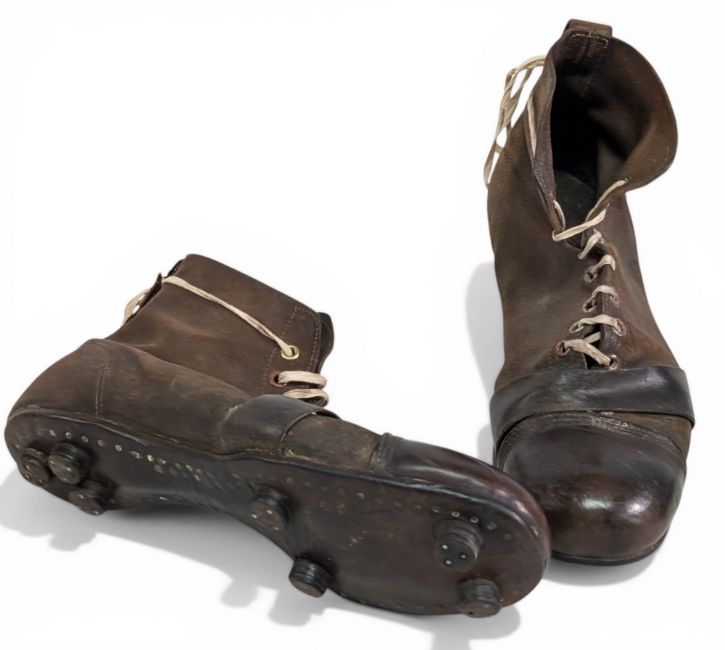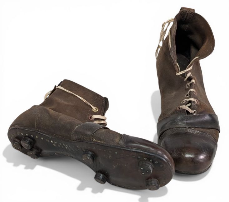 Pair of period c1920 adults leather Football Boots, with nailed leather soles and studs, used size 9