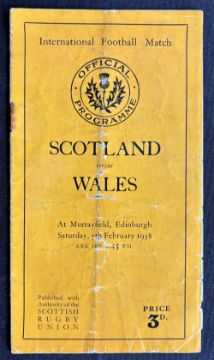 1938 Scotland v Wales Rugby Programme: Murrayfield. Grubby and worn but spine still pretty good, usual Edinburgh slim orange 8 sides
