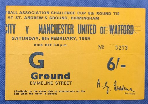 TICKET: 1968/69 Birmingham City v Manchester United FAC match ticket 8 February 1969; alternative Watford crossed out, o/wise fair/good. (1)