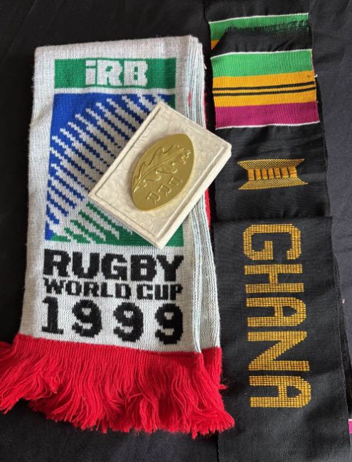 1999 And Before, Rugby Scarves and Symbol (3): RWC 1999 scarf, small and v colourful Ghana scarf, and a boxed oval gold metal Romanian Rugby Federation oak leaf symbol. G/VG