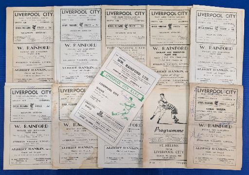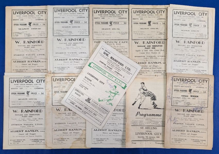 1952-1967 Liverpool City Rugby League Programmes: v Halifax 15th March 1952, v St Hens 2nd Oct 1954, v Halifax 19th Jan 1957, v Leigh 8th Match 1958, v Wides 9th Feb 1957 Cup, v Wigan 24th Jan 1959, v away at St Helens 9th Jan 1965, v Wigan 16th April 1960 with signatures, v Wigan 10th Dec 1967, plus 2 part programmes - both missing middle pages