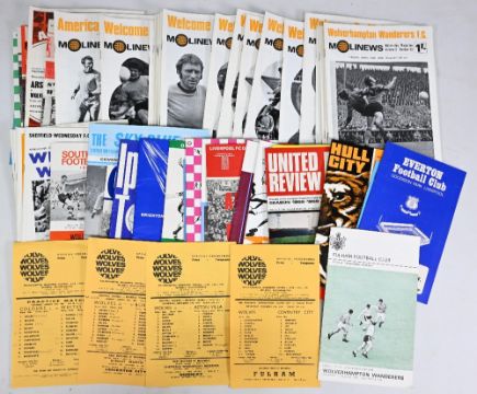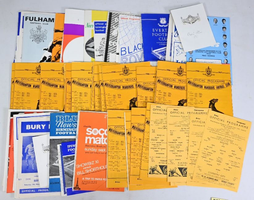 1965-70 Wolves Wolverhampton Wanderers Home & Away league match programmes: 65-66 home x28 Challenge Cup replay Manchester City v Everton at Molineux SS, Central League v Bury SS Sheffield United, Youth Challenge Cup Birmingham City, aways x22 Roy Swinbourne All Stars, Showbiz XI v Bill Shorthouse All Stars, 66-67 home x28 Mansfield Town League Cup 2nd round practice match v whites, Central League v Blackburn Leeds, Youth Cup v Coventry, aways x23, 67-68 homes x24 practice match SS v whites, Central League v Leicester, Burnley, Coventry, Aways x23, 68-69 home x26 Intercity match v St Miren, FA Youth v Stoke, aways x25, 99-70 homes x26 Inter League v Kilmarnock, Anglo Italia v Lazio, Fiorentina, aways x23