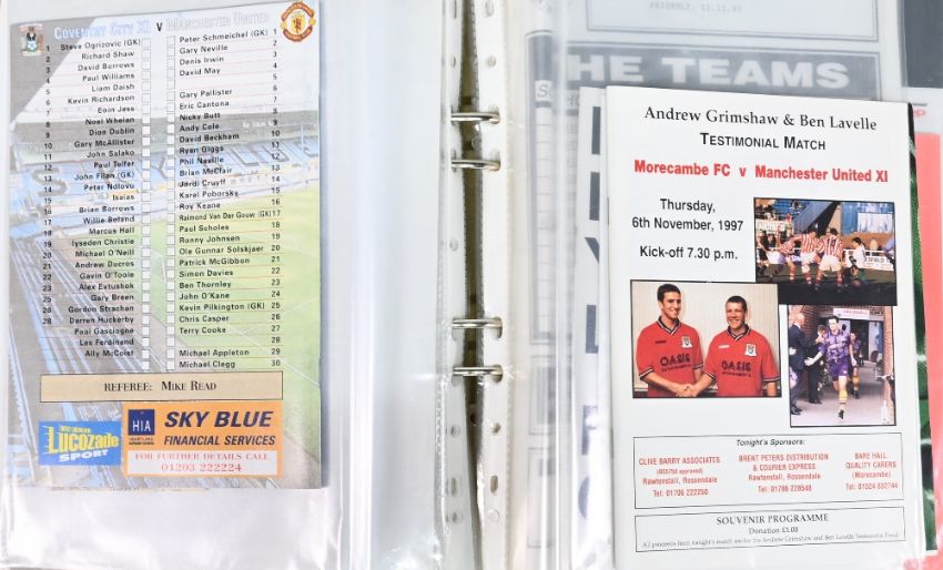 Collection of Manchester United European aways 1992/93 Torpedo Moscow, 1995/96 Rotor Volgograd, 1996/97 Rapid Vienna, Borussia Dortmund, 1997/98 AS Monaco, Juventus, Feyenoord, FC Kosice, Feyenoord (pirate), 1998/99 Brondby, Inter Milan, Lodz (pirate), 1999/2000 Marseille, Fiorentina (pirate), Real Madrid (pirate), Bordeaux (pirate), Sturm Graz (pirate), PSV Eindhoven (pirate), Anderlecht (Sports issue), Dinamo Kiev (pirates) x3 different, Dinamo Kiev, Sturm Graz (pirate), 2001/02 Bayern Munich (pirate); 2000 Club World Championship Brazil, 1999/2000 Premier matches away at Everton, Arsenal, Coventry City; Separate file containing United away friendlies 1990s/2000s (2) plus “A Salford Lad” softback by Roy Cavanagh about Eddie Colman; overall good. (A Lot)