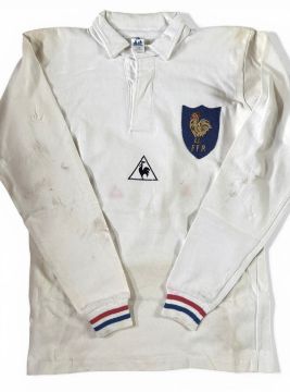 1987 Denis Charvet’s Grand Slam-Winning French Rugby Jersey: Official issue no.12 white Le Coq Sportif-made jersey with blue FFR and cockerel shield badge and makers’ logo, navy ‘shadow’ 12 to rear, red and blue cuff hoops, worn but the stylish, skilful centre in a France Grand Slam season, almost certainly v Ireland in the clincher. Match and display marks but all the more evocative, G/VG