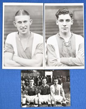 Pre-War b&w photos of Oldham Athletic players, all postcard size, 1938 J. W. Smith, 1938 W. Jordan, 1939 August 15th war abandoned season Tom West, Tom Hampson and Arthur James sitting (in football kit); (3)