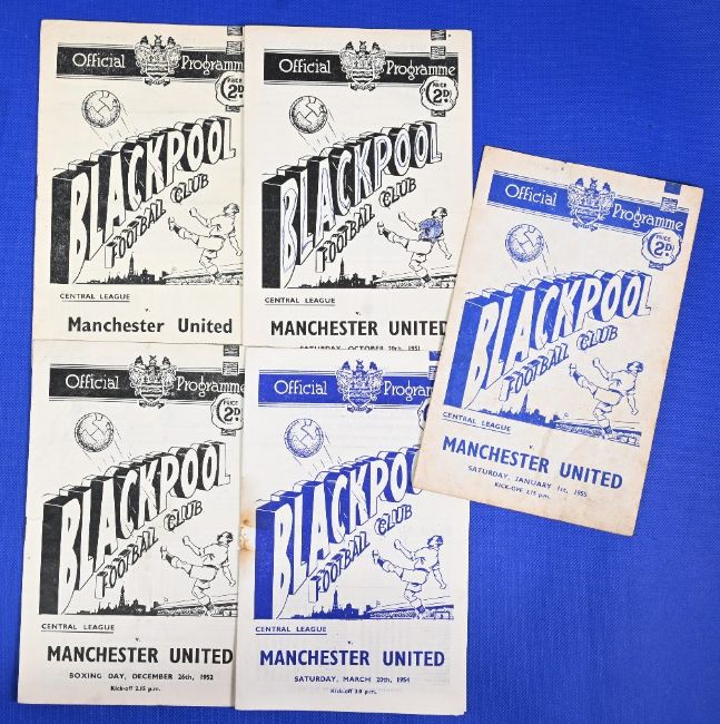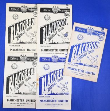 Manchester United reserves away match programmes v Blackpool reserves 1950/51, 1951/52 (writing to cover), 1952/53 (Duncan Edwards), 1953/54, 1954/55; usual faults. (5)