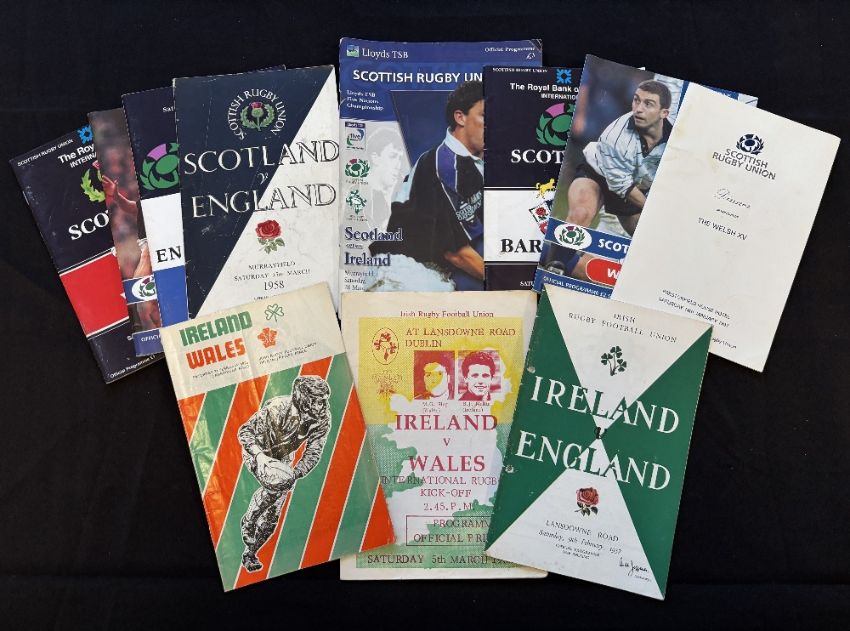Irish and Scottish International Rugby Programmes etc (10+): Ireland v England 1957 (p/h) and v Wales 76(cr) and almost amusing ‘cut and paste’ pirate 88; Scotland v Wales 97 (plus menu signed by Doddie Weir, Peter Walton etc) and 89, v England 58 and 94; v Ireland 97 and 99; and v Baabaas 91. G/VG