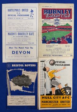 Manchester United away FA Cup match programmes v 1948/49 Hull City 6th round, 1953/54 Burnley 3rd round, 1955/56 Bristol Rovers 3rd round, 1956/57 Hartlepools Utd 3rd round (programme no. 4434); good. (4)