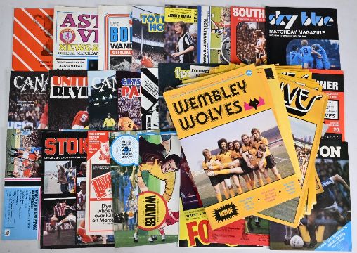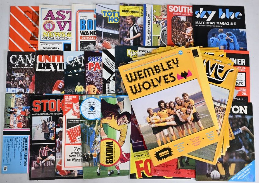 1975-80 Wolves Wolverhampton Wanderers Home & Away Football Programmes: League, Cups, Friendly, Testimonials noted - 75-76 home x29 to include FA Youth v Newcastle, A Youth final v WBA, Doug testimonial, away x28 to include Frank Clark testimonial, v Manchester Unites 6th round FA Cup, 76-77 home x29 friendly v Coventry, Mike Bailey testimonial, away x26, 77-78 home x25 with Phil Parkes and Jack Taylor testimonials, away x26 with friendly matches of Southampton, Crystal Palace, Brighton 78-79 home x24 John McAlle testimonial, away x27 with semi final FA Challenge Cup v Arsenal, 79-80 home x39 with Central League v Manchester United single sheet Derek Parkin testimonial Wolves Wembley, away x27 semi final 1st leg v Swindon