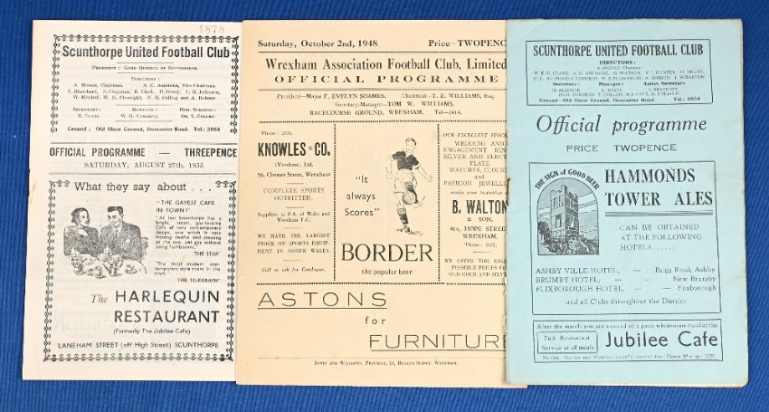 Selection of Oldham Athletic away match programmes 1951/52 at Scunthorpe United, 1948/49 at Wrexham, 1955/56 at Scunthorpe United; fair/good. (3)