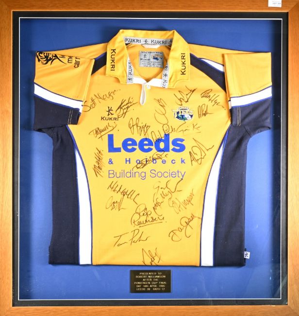 2005 Leeds Tykes signed framed Rugby Jersey: Presented to a supporter following Leeds’ 20-12 win over Bath in the 2005 Powergen Cup Final, an official Kukri-made gold, blue and white Leeds Tykes jersey, signed by the squad in black marker and nicely mounted on blue and in a brown wood frame with small metal plaque. Excellent