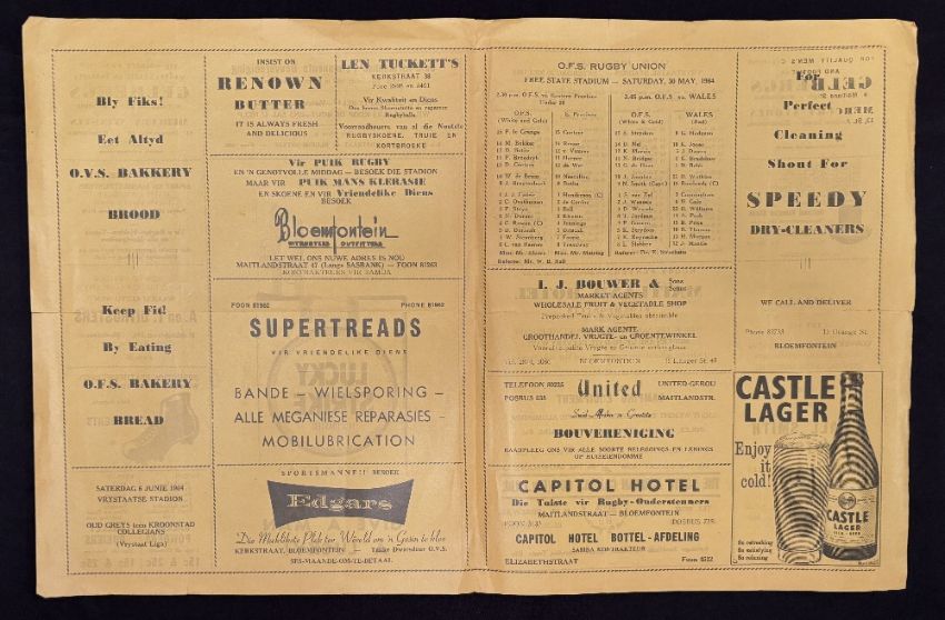 1964 Orange Free State v Wales Rugby Programme: As with lot 73, scarce large foldover style from this clash with the OFS on Wales tour over 60 years ago. Comes with letter from the supplier of the issue. In G/VG condition for its age. Great chance