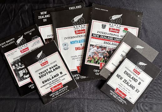 1992 England ‘B’ in NZ Rugby Programmes (8): The full set from the England second-string’s tour to NZ, v N Otago, Southland, NZ Univs, Wairarapa/Bush, Wanganui, N Auckland and both NZ XV encounters. VG