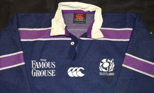 2002 Matchworn Tom Smith Scotland Rugby Jersey: From the 2002 game v England, blue/maroon with hacked-off shortened sleeves, CCC, RWC and SRU logos, white No. 1 to rear. Sadly passed away at 50 in 1922, a great loose head. VG