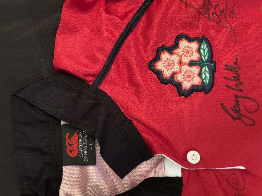 RWC 2003 Japan Matchworn and Fully Squad Signed no. 11 Rugby Jersey: Super, one of rugby’s most attractive jerseys, the distinctive cherry and white hoops made by CCC (Canterbury) , with JRFUs cherry blossom and RWC 2003 logoes and what look to be over 40 signatures. Special memorabilia, excellent