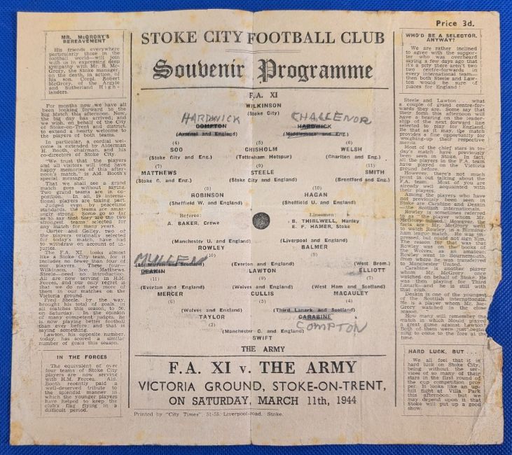 1944 War Time Football Programme, At Stoke City, The Army v FA XI, 11th March 1944 at Victoria Ground, single sheet inc. Matthews, Scoo, Cullis, etc (folded and marked)