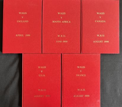 1999 VIP bound editions, WRU Home Rugby Programmes (5): Scarlet hardcover examples, official WRU issues for the Wembley Wonder Win v England 1999, and v S Africa (New Stadium, 1st win v Boks), Canada, France and USA. N Mint