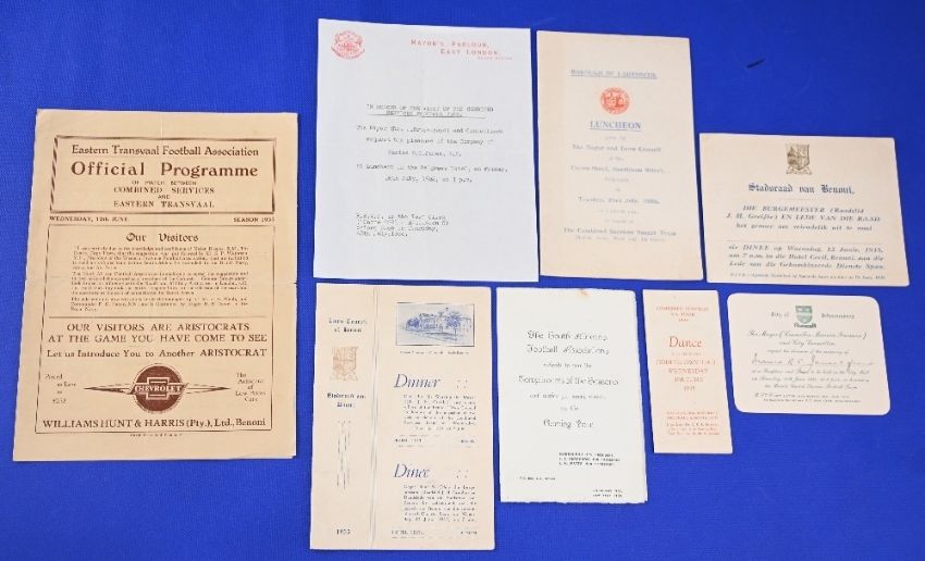 1935 Tour of South Africa Eastern Transvaal v British Combined Service match programme 12 June 1935, 4 pages (fair/good); Also Dinner Menu and toast list from Benoni Town Council at the Hotel Cecil, Benoni 12 June 1935 plus the formal invitation card; also other items from the tour to include Marrtzburg Direct FA invitation card for the dance at Oddfellows' Hall 19 June 1935; letter invitation from Mayor's parlour, East London for luncheon at the Belgrave Hotel 26 July 1935; City of Johannesburg Mayor and Councillors, reception and dance at the City Hall 27 June 1935 for the British United Services Football Team at 8pm card; South African FA "Compliments of the Season and success in the New Year from the President" Xmas 1935 (small b&w card); fair/good. (A Lot)