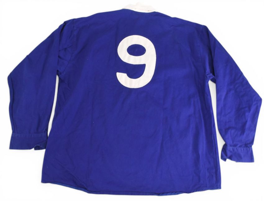 TOFFS Retro shirt 1948 Manchester United FA Cup Final; dark blue, long sleeved, white collar, badged, has no. 9 to the reverse, Jack Rowley scored 2 goals in the final; good. (1)