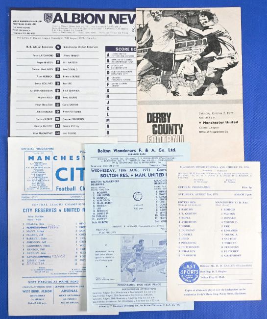 Manchester United reserves 1971/72 aways Manchester City, Derby County, Blackburn Rovers (tear), WBA, Bolton Wanderers (mid-week), varied condition. (5)