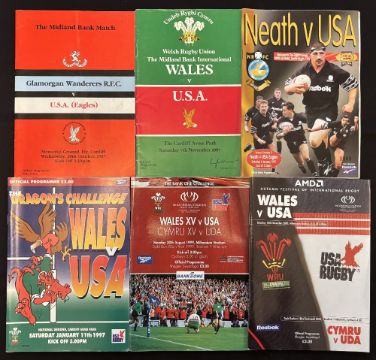 1987-2000 USA in Wales Rugby Programmes (6): 1987 v Galm Wanderers and Wales; 1997 v Neath and Wales; and 1999 and 2000 v Wales. VG