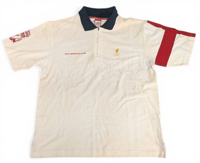 Liverpool Football Polo Shirt signed Phil Neal, with zip front, short sleeve, size M, “you’ll never walk alone” to back, with a large Phil Neal signature across the front in biro