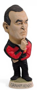 Graham Henry 1999 Grogg Rugby Figure by Richard Hughes: ltd ed 26/250 c.9” Welsh track-suited figure of the famed coach from NZ who restored Welsh fortunes before coaching the All Blacks to RWC success. Boxed, excellent