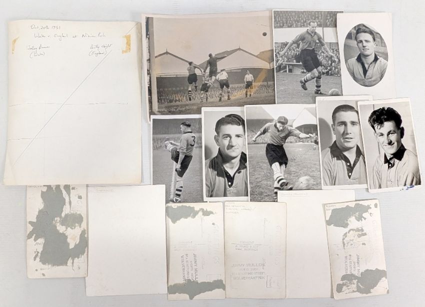 1950s Wolves Wolverhampton Wanderers Postcards Press Photographs: to include a good signed R Flowers press postcard (removed from album page), John Hanncoks photograph, Peter Broadhurst photograph, Dennis Wilshaw photograph, press photographs of R Pritchard, A MacLean, J Dunn, Bill Short house photo, and postcard. All taken from an album of L Smith, Wilshaw, B Slater, B Shorthouse, J Murray, plus 1951 photograph of Wolves v Preston NE, Nov 10th press photograph of Wales v England, 1951 Billy Wrighy leading out England