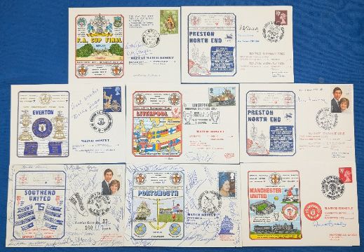 Eight 1978-1981 signed Football FDC covers, Manchester United v Manchester City Matt Busby, Everton v Liverpool Dixie Dean, Portsmouth v Fulham multi signed by the Portsmouth team, FA final 1981 Manchester City v Spurs Joe Corrigan, 1981 Southend 75th anniversary multi signed by the team, Liverpool v Oulun Palloseura Ian Rush, Preston v Burnley Tom Finey, Ron Severs (Dawn 8)